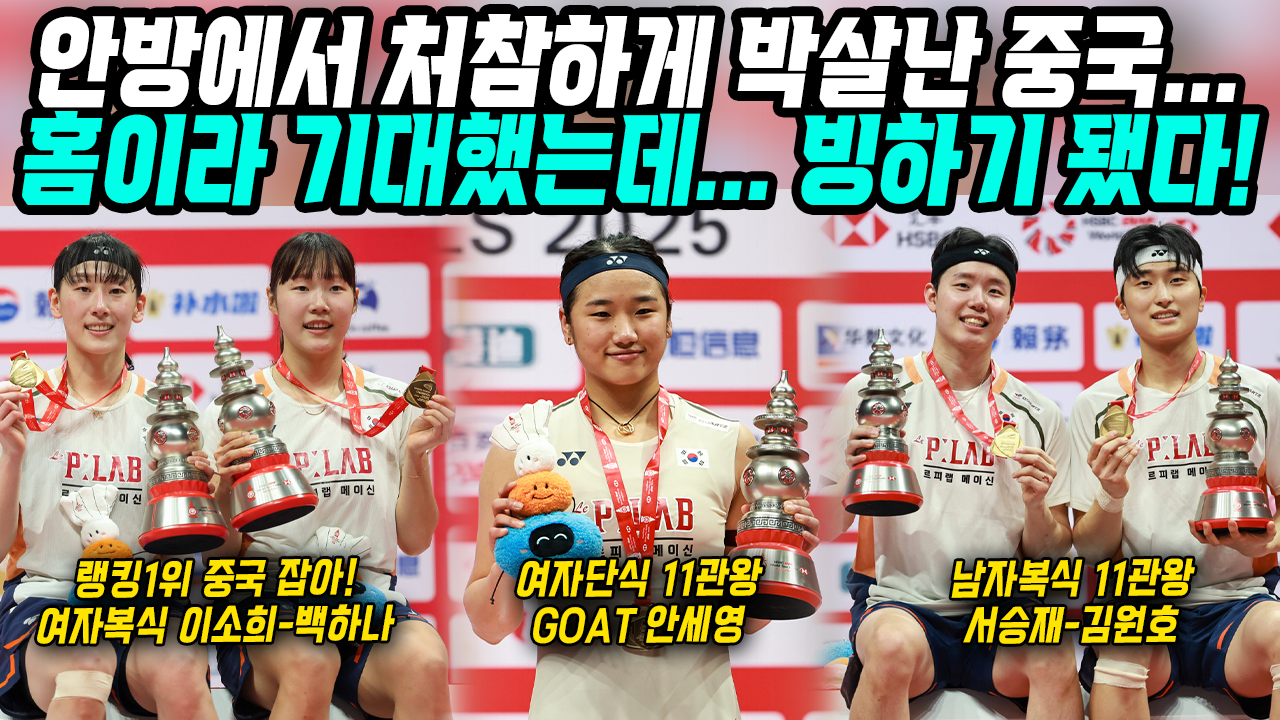 - 남자 복식 (김원호·서승재): 세계 랭킹 1위답게 중국 조를 압도적인 기량으로 누르며 안세영 선수와 나란히 단일 시즌 11승이라는 대기록의 동반자가 되었습니다.